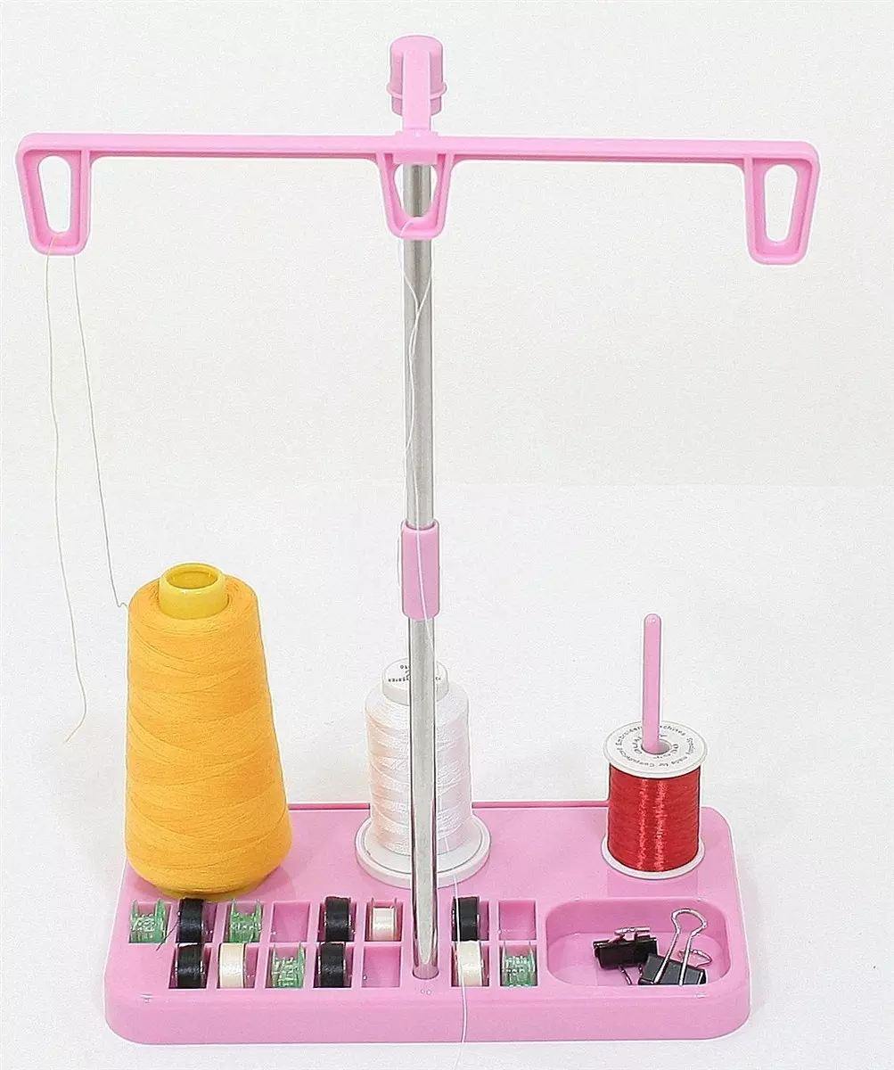 3 Spool Thread Holder Stand for Embroidery, Sewing, and QuiltingThis spool holder stand will hold up to 3 spools of thread for your sewing or embroidery project. You can also store up to 15 bobbins and additional sewing supplies like a ruler and pins. Easy to assemble without tools. Easy to use and disassemble for storage ease. rnNice Thread Stand to help the thread unwind properly from any size spool to prevent thread breakages. Approx. 4.5 x 8.25 inches at the base and stands 17.5 inches high Holds 3 spools, 15 bobbins, a place for pins and a ruler. (thread not included)Made of ABS plasticCan be used for Small and Large Size Spools of Sewing, Quilting, Embroidery etc.