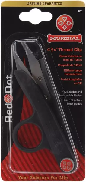 4 3/4″ Red Dot Thread Clippers – MundialrnMUNDIAL-Red Dot Thread Clips. When you’re serious about your sewing and crafting you should be serious about your cutting too! Mundial Red Dot 4-3/4in Thread Clips scissors feature cutlery quality stainless steel blades designed for maximum control and sharp straight accurate cutting. All Red Dot scissors have an adjustable pivot assembly protected by Mundial’s signature red button and the matte black polypropylene handles prevent slippage.