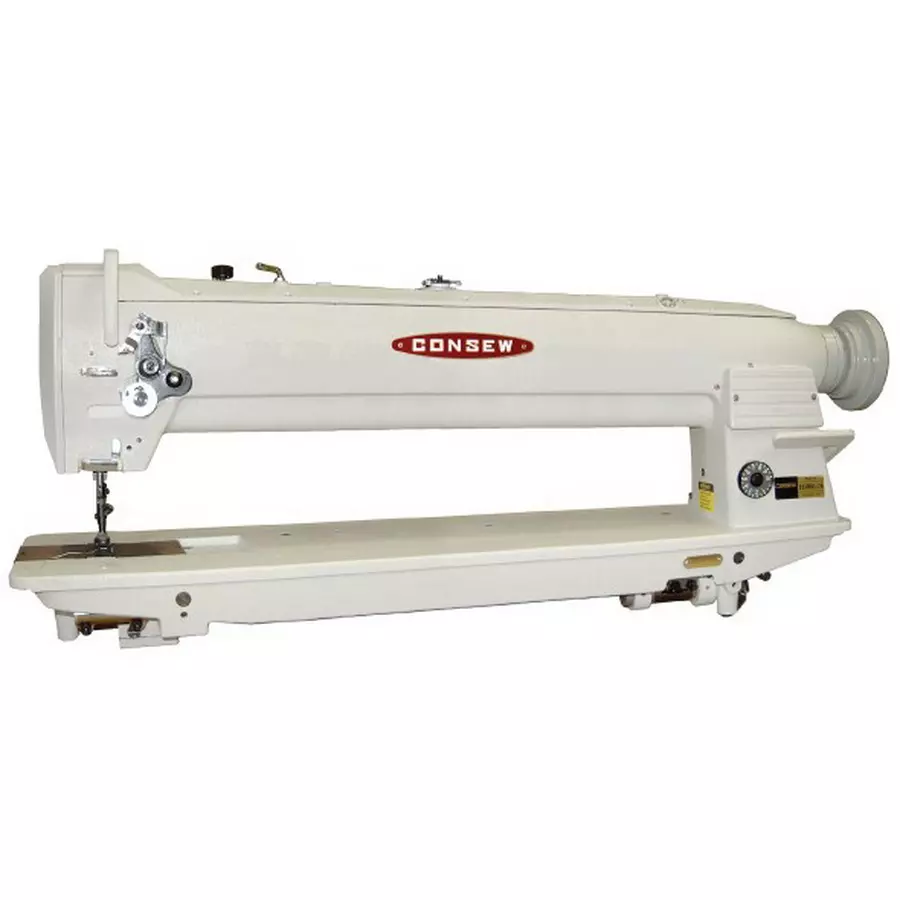 Consew 255RBL-25 rnHeavy Duty Single Needle Triple Feed Drop Feed Needle Feed and Alternating (Walking) Presser Feet Lockstitch Machine Industrial Sewing Machine Comes With Table, Legs, Servo Motor and LED LamprnWith: Large Bobbin and Vertical Axis Hook, Centra-Lube®, Semi-Automatic Lubrication System, 2 1/2 S.P.I. (10mm) Stitch Length, Reverse Feed, Safety Clutch