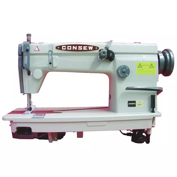 Consew 326 Series Heavy Duty Double Chainstitch Sewing Machine w/ Table & Servo MotorrnHigh Speed, Single Needle, Tandem or Two Needle, Drop Feed, Double Chainstitch Machine With: Automatic Lubrication System, Dial-Type Stitch Length Regulation, Cam-Type Take-Up Lever, Hinder Presser Foot