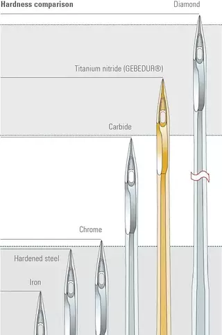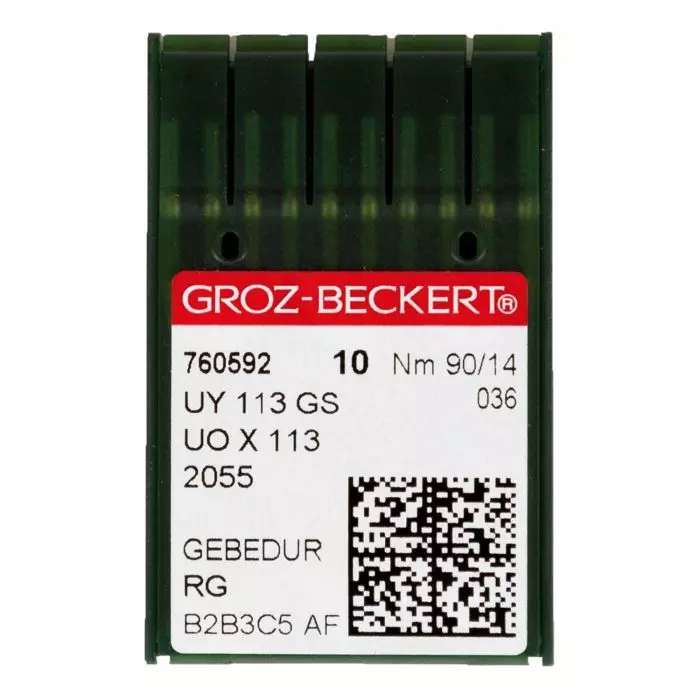 GROZ-BECKERT – UY 113 GS/2055 GEBEDUR Sewing Machine NeedlesrnPoint style: RGNeedle size – Part Number: rn75 / 11 – 76057290 / 14 – 760592100 /16 – 763282110 / 18 – 763432rnCoating: GEBEDUR – Titanium Nitride CoatedLength butt to eye: 366Shank diameter: 200Packing Unit: Sold in packs of 10 and 100rnPOINT STYLErnRound point with small ball pointStandard for chain stitch; for fine, delicate knit fabrics, microfiber, woven fabrics, sewing buttons, embroidery and fine, soft clothing leather (FST 401 and 406)rnApplicationShirts, trousers, various types of garmentsrnOther point designationsSTU, STUB, S BALL, SET RTrnGEBEDUR® – needles with titanium nitride coatingrnIn demanding sewing processes, for instance when sewing hard materials and material combinations, needle wear often occurs, particularly in the point and eye area. The special GEBEDUR® surface coating provides the needle with increased wear resistance, allowing it to withstand extreme conditions much longer.rnThe special featuresrnTitanium nitride surface coatingHigher of hardness than with standard needlesrnThe advantagesrnHigher protection against wear and damage, primarily in the point and eye areaConsistently high standard of seam qualityLonger service life of needlesIncreased productivityrnDue to the above specified characteristics, certain special application needles such as the SAN® 5 or the SAN® 6 are coated with GEBEDUR® as standard.