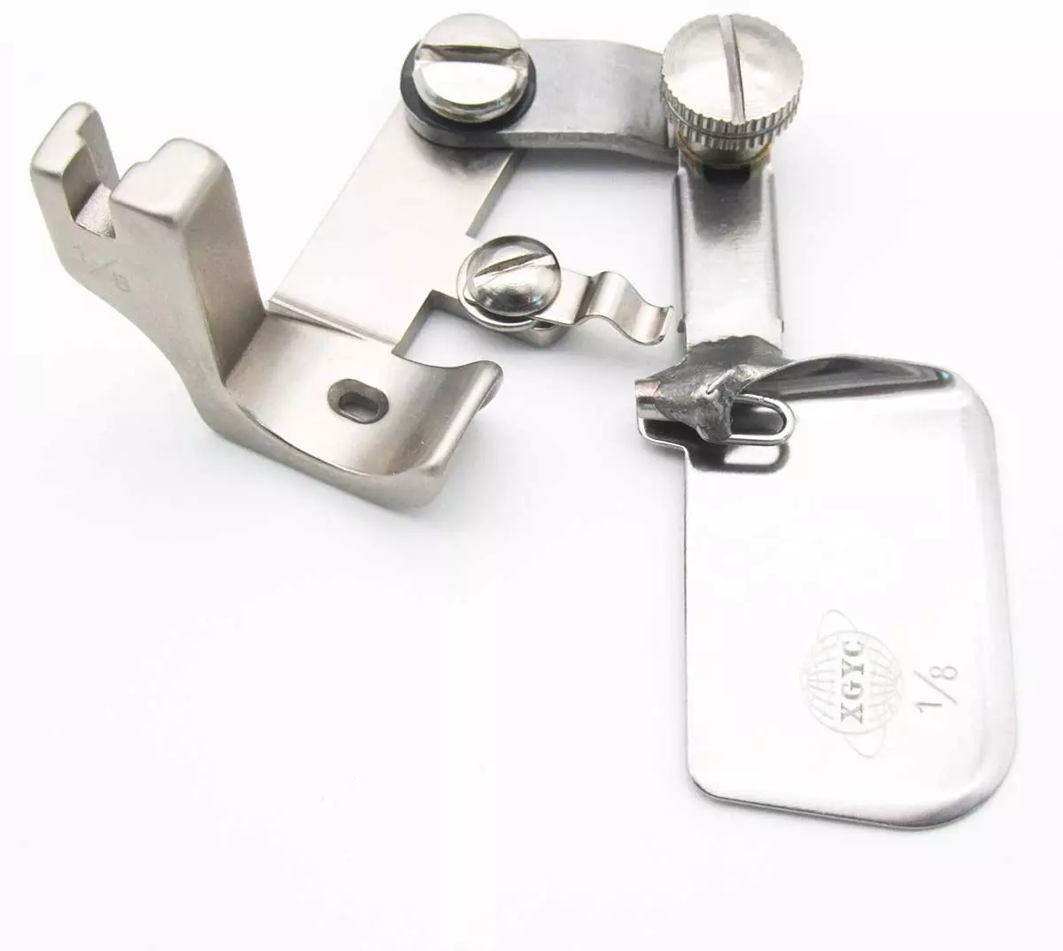 Hemming Presser Foot and Folder Set rnPart Number – F502rnThis can be used for silk and chiffon fabric material, for high speed edging. It makes the clothes turnings ( round angle of turning) smooth.rnAVALIABLE SIZES:rn1/8″ ,1/4″, 3/16″, 3/8″, 5/16″rnMACHINE COMPATIBILITY:rnArtisan Models: 196R, 5550N, 8500N, ZJ-100Brother Models: B705, B707, B715, B716, B735, B737, B738, B745, B755, B757, B758, B767, B781, PQ1300, PQ1500Consew Models: 30, 98, 99, 102, 103, 105, 210, 217, 218, 219, 220, 230, 231, 290, 310, 2230, 7360R-1Econsew Models: DDL-5550, DDL-8500, DDL-8700Feiyue Models: 8500, 8700Gemsy Models: 8700Janome Models: 1600P, 1600DB, 1600DBXJUKI Models: DDL-127, DDL-227, DDL-500, DDL-552, DDL-553, DDL-555, DDL-5550, DDL-5600, DDL-8300, DDL-8500, DDL-8700, DDL-8900, DDL-9000, TL-98E, TL-98Q, TL-2000Qi, TL-2010QMitsubishi Models: DB-120, DB-121, DB-122, DB-126, DB-130, DB-170, DB-189, DB-199, LS2-130, LS2-150, LS2-180, LS2-190, LS2-1130Necchi Models: BU, Supernova, and others with the high shank presser foot systemReliable Models: MSK-8800, MSK-8550M, MSK-8870MRex Models: RX8500Singer Models: 31-15, 95, 96, 120U, 121C, 121D, 188K, 191D, 195K, 196K, 241, 251, 281, 366K, 400W, 402W, 451K, 491D, 591D, 600W, 660A, 691D, 770D, 771D, 2191, 2491DSunstar Models: KM-123A, KM-123B, KM-137A, KM-137B, KM-146BL, KM-250Tacsew Models: 5550, 8500, 8500-T, T8700Taiko Models: TK-505, TK-510Yamata Models: FY8500, FY8700rnAnd many other comparable industrial lockstitch sewing machines.rnPresser Foot Shank Type: High Shank rnPresser Foot Type: Hemming Presser Foot and Folder Set