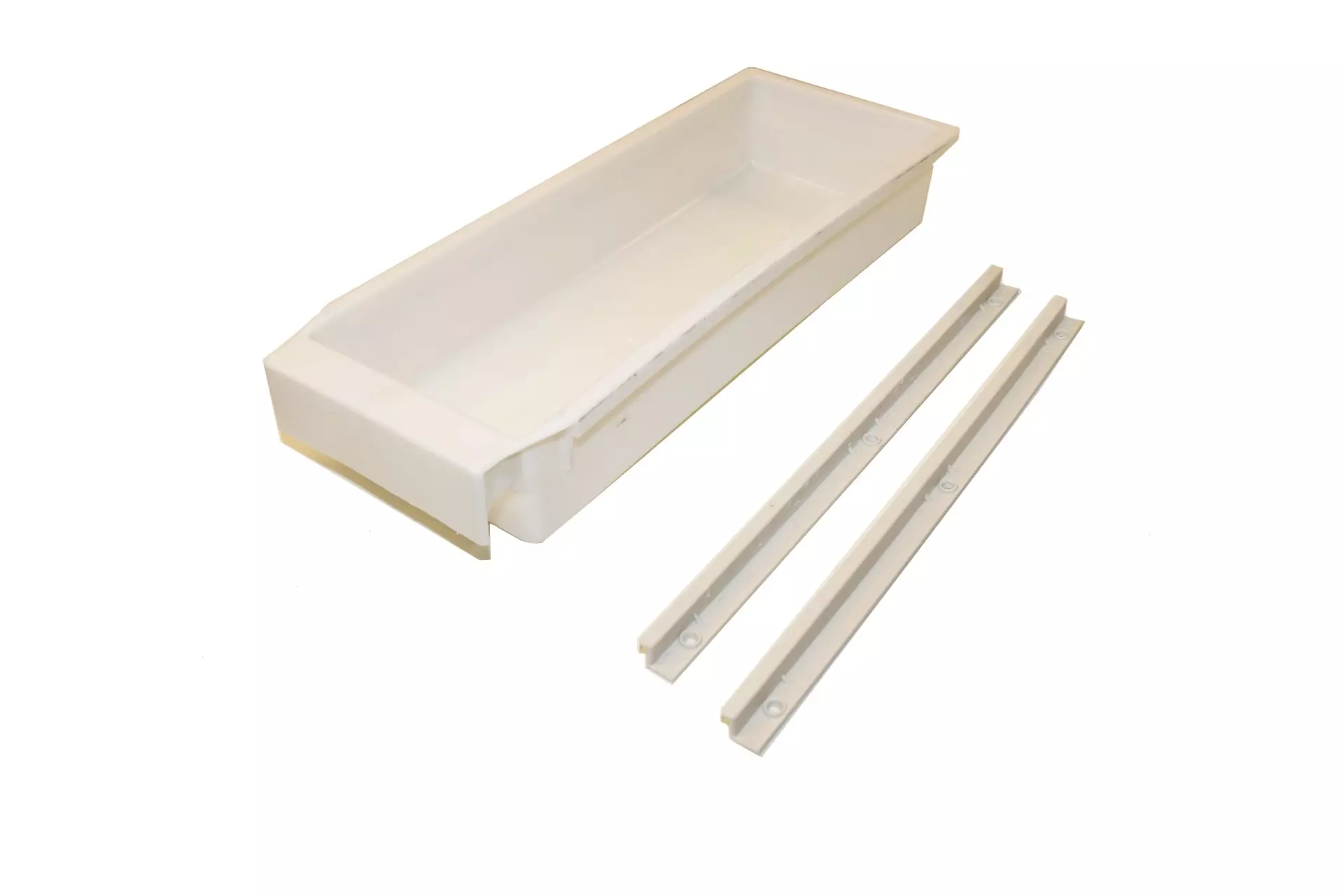 Industrial Sewing Machine Drawers for Table StandrnThis brand-new high-quality plastic drawer comes complete with sliders and screws for mounting. A must for a sewer to keep any machine-specific tools right with the machine or workspace. Includes 1 drawer and 2 slider rails with screws.rnSize: 13-3/4″ long X 2″ wide X 5″ depth