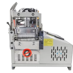 New Generation Electronic Hot Cutting Machine – Jema #JM-120EHrnThis New generation hot cutting machine works automatically by only setting speed, length, quantity, and temperature. It will stop automatically if the material runs out during operation.rnIt can cut a wide variety of materials, such asrnStrip TapeRibbon TapeBag BandSmall WebbingrnMACHINE FEATURES:rnHigh Speed: Can cut 100-120 pieces per minute (50mm long)Accuracy: Adopt High-Accuracy Stepping Motor DriveTouch Control Panel System: Adopt PLC system, multilingual conversion by the touch panel. The page of function is intuitive and easy to operate setting is convenientFault Self-Checking: Cutting sensor error, no supply; the error code will show on the system panel directly if the fault happened.Cutting Type: Melting and cutting by hot knife, the woven label is cut neatly without fraying but not for heavy materials and installed with an anti-static electricity device.Compensation: After inputting the actual length data, accurately cut out the length to meet the system settings.Maximum Cutting Width: 98mmCutting Length: 20 – 99999