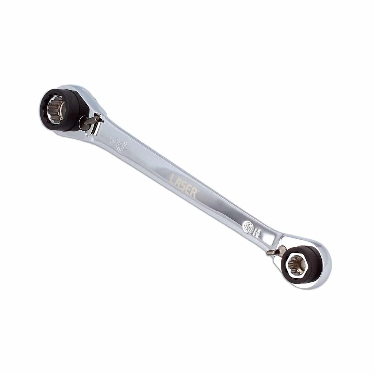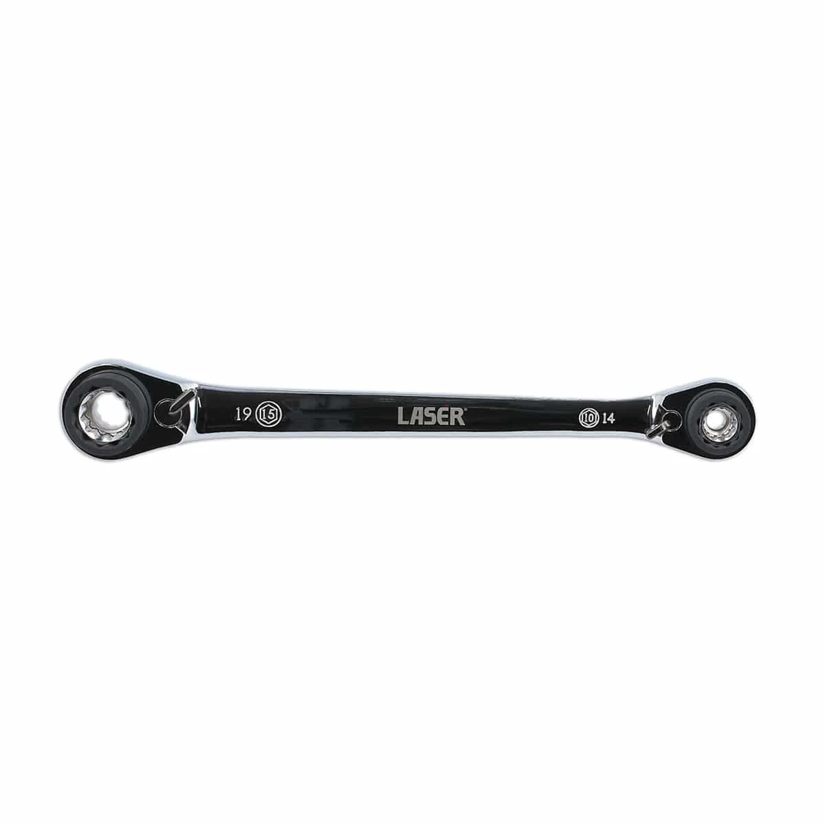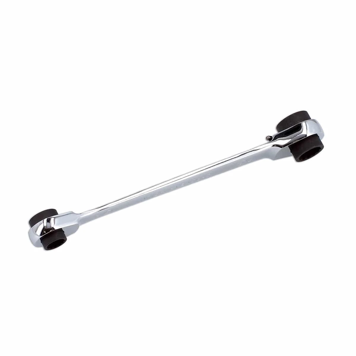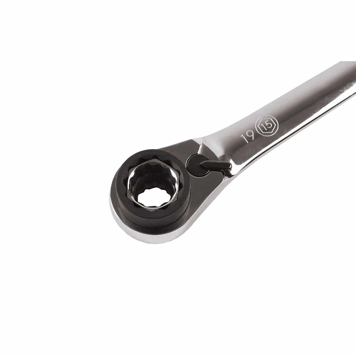Double ended, reversible ratchet ring spanner. Innovative design allows 8 different Bi-Hex (12pt) sizes in one spanner, from 8mm to 19mm.