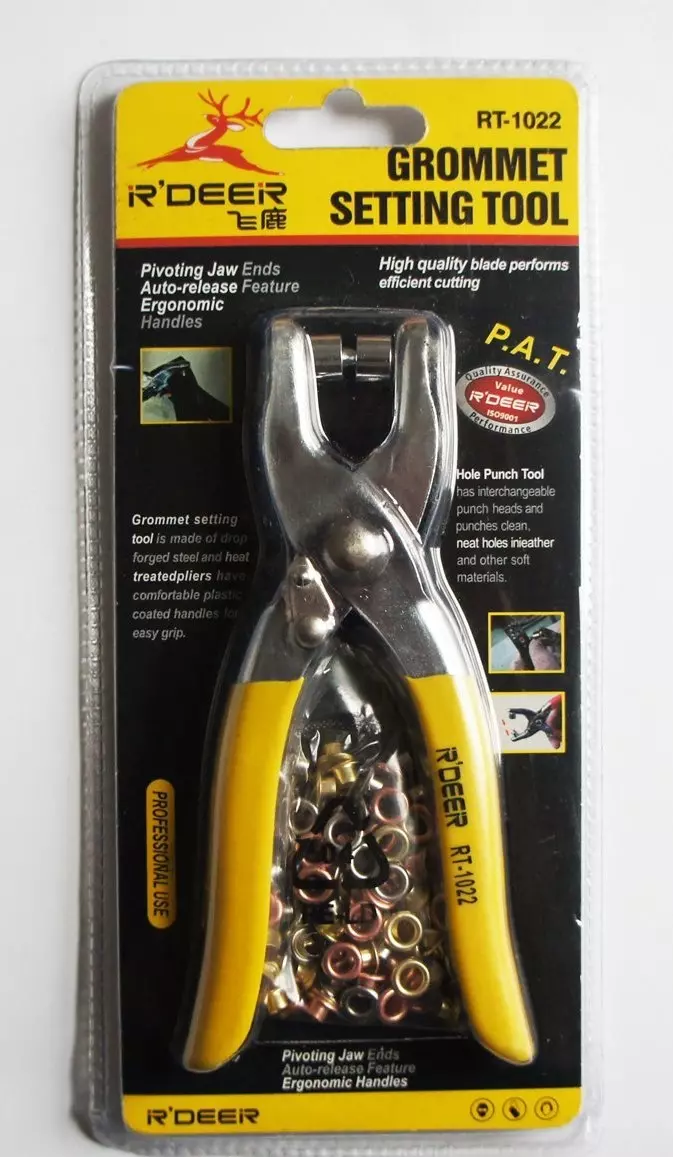Grommet setting tool is made of drop forged steel and heat treated pliers have comfortable plastic coated handles for easy grip.rnrnPivoting Jaw Ends,rnAuto-release Feature Ergonomic Handles.rnHi quality blade performs efficient cutting.rnrnEyelet plier comes complete with appx 100 Pieces eyelets