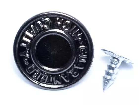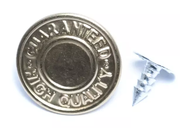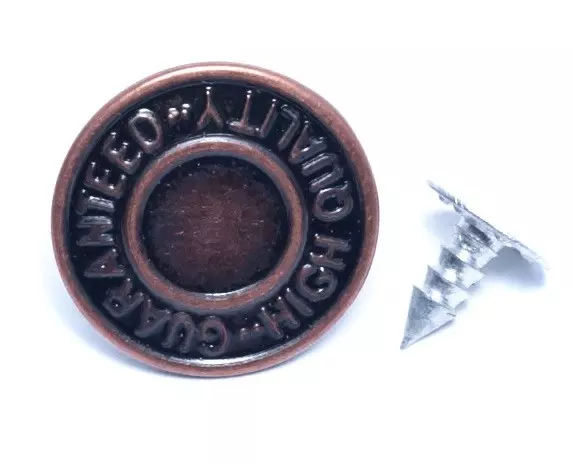 Rivets – Jean Button – Text DesignrnJean Button Rivets are designed and manufactured for jeans of different fabrics. It adds an ornamental appeal to your apparel; not just this, it adds a distinctive touch to the shoes, hand clutch, and purses while securing the fabric or any other material securely. The button secures two surfaces and can be applied using a hammer/anvil hand setter. The ornamental jeans’ rivet quality finish adds to the durability and offers long-lasting performance. They withstand everyday wear and tear. And makes it suitable to be used with denim, fabrics, canvas, and leather.FEATURES:rnSEWING SUPPLY: The fabric rivets are specifically used to join two materials closely with each other, permanently and securely. It can be easily used with a hammer/anvil hand setter, which makes it easy to install. rnFASHION ACCESSORY: These belt rivets not just look great but adds a decorative element and are used as a fashion utility. The text design makes it unique and lends a classic touch to the overall appearance. It elevates any fabric on which it is embedded. rnCONSTRUCTION: The fashion rivet is made using premium-grade material that makes it durable and withstands everyday wear and tear. It is embossed with text on the face that won’t get distorted, while the quality finishes make them appear classic and traditional.rnUSABILITY: The jeans rivet is not explicitly used on fabrics inclusive of denim, canvas, and leather, but it can also be used to add a distinctive element to hand purses and, in mixed media, craftworks by the artists.