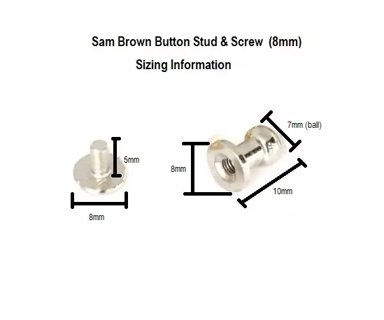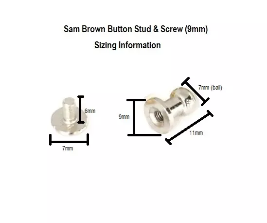 Sam Browne Button Stud And ScrewrnSam Browne Button Stud & Screw is ideally used as a decorative accessory that securely holds two different surfaces together without letting them slip off. The designer button-head studs are given a smooth finish that looks impressively beautiful and lends a classic touch to the overall appearance once embedded. It securely holds two materials with the screw and can be used on leather, crafts, clutch ribbons, purses, handbags, belts, and numerous other materials. The non-permanent application will allow you to change the rivet for color or design whenever required. The material is sturdy enough to hold the fabrics without getting deformed when slight pressure is applied; instead, these are designed to withstand normal wear and tear. Use a setting tool for proper alignment. It is widely used by crafters for mixed-media projects too. rnFEATURES:rnDESIGNER STUDS: The button-head studs are ideally designed to be used as a decorative element to uplift the overall appearance of fabrics, leather, and canvas. The classic-designer stud holds the materials for the non-permanent application securely. You can replace it for color and design whenever required. rnEASY-TO-USE: The studs offer a simple and secure way of holding two things quickly. Keep the classic rivets in your fixing tool kit and embed them with the help of a hammer/anvil hand setter or screw designer for proper alignment. Then, poke a hole on the desired surface to securely push the stud in place. rnSMOOTH FINISH: Designer stud rivets undergo a unique plating process that ensures smooth and shiny surfaces. The quality finishes not just boost the appearance but make it sturdy enough to withstand everyday wear and tear; it adds to the durability.rnVERSATILE: Use DIY stud-button rivets on fabrics, including jeans and jackets, or use them for mixed-media craft projects. Fix the screw studs and rivets on shoes, purses, leather, packages, ribbons, belts, and other materials, including wristbands, handbags, clutches, or other materials. rnSPECIFICATIONS: 8mm & 9mm Sam Browne Button Stud & Screw-in silver, gold, gunmetal, and bronze finish, is available in a pack of 100 & 1000.rnYou may be interested in our grommet press machine and die set to apply your rivets grommet press machine and die set.rnrn*See photos for additional sizing/dimensions