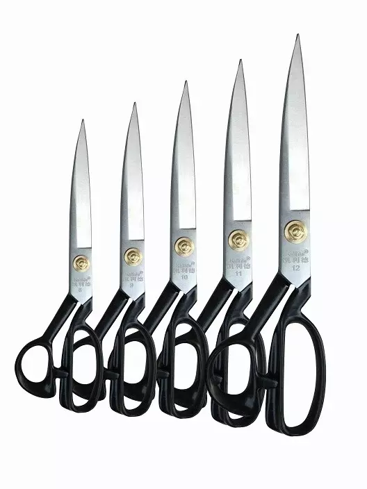 Professional Tailor Shears – Touro Tesoura rnUsed two pieces of leaf springs for shears adjustment and best fit Extra cutting power for heavier fabrics – leather, canvas or multiple layers Classic offset handle design produces clean, even cuts along table surface Over-sized handle and thumb ring allows natural, comfortable hold with excellent control Highly burnished shears surface. Used high quality and special composite steel materials for bladesrnAvailable Sizes:rn8″9″10″12″
