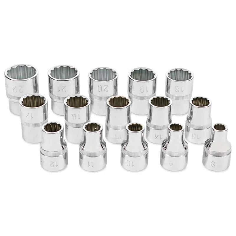 These 3/8″ drive sockets feature bi-hexagonal or 12-point gripping ridges to work with a wide variety of fasteners.